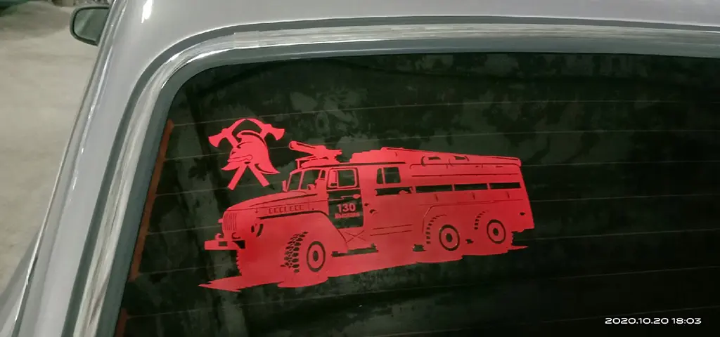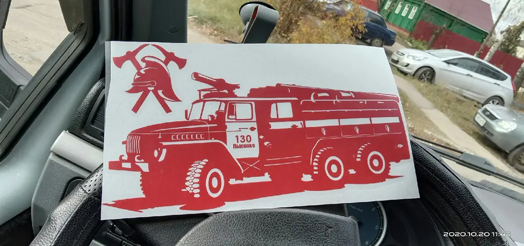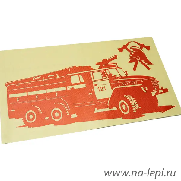 Наклейка «Пожарная машина АЦ-40-43202» - изготавливается плоттерной резки (без фона). Наклейка с изображением пожарного автомобиля АЦ-40-131 на базе советского автомобиля УрАЛ-43202 и эмблемой пожарной охраны. Наклейка легко наносится на стекло, металл, пластик или любую другую гладкую и ровную поверхность.